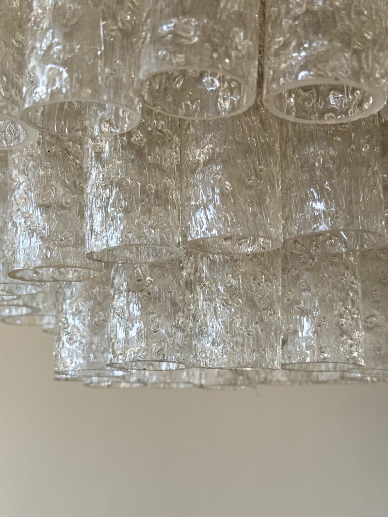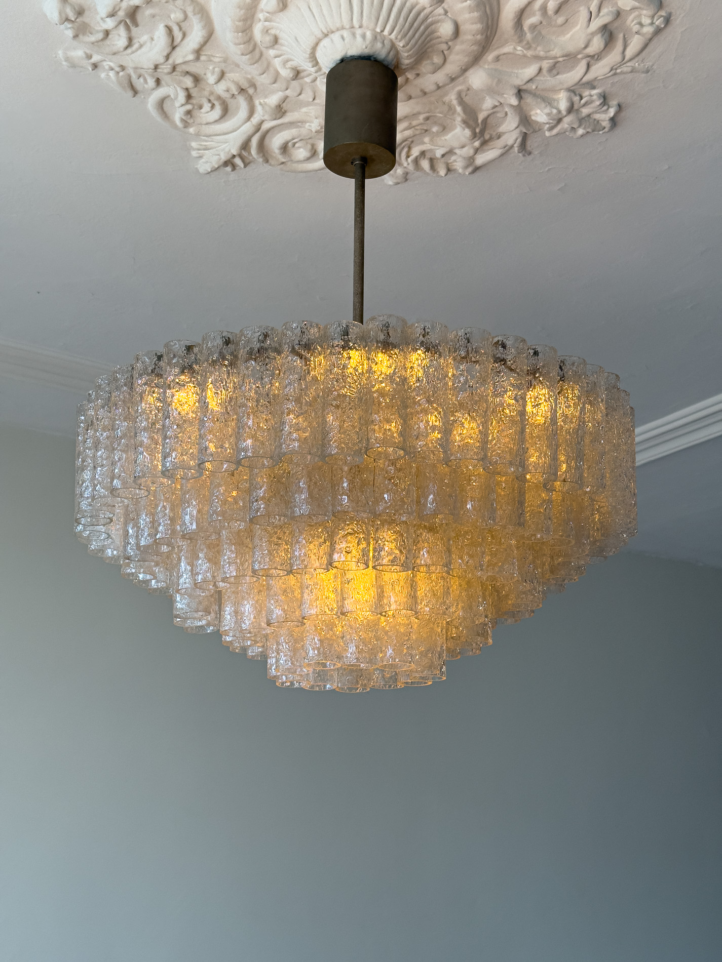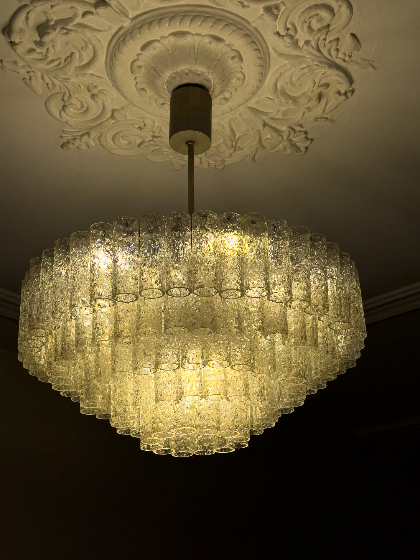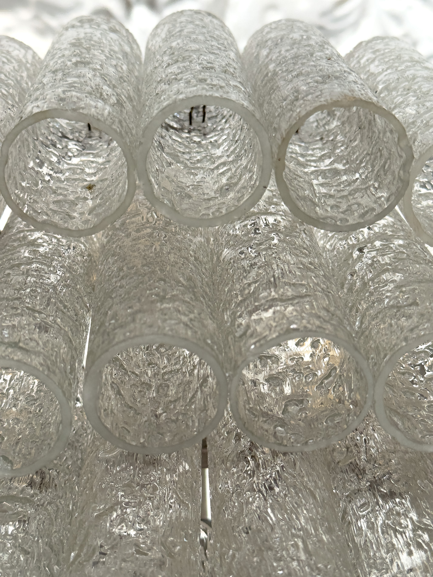 An impressive and elegant lighting statement by Doria Leuchten, featuring a luxurious composition of approximately 180 frosted glass cylinders arranged in a refined, architectural structure. This striking chandelier is equipped with 16 light sources, creating a warm, atmospheric glow while beautifully diffusing light through the textured glass.
