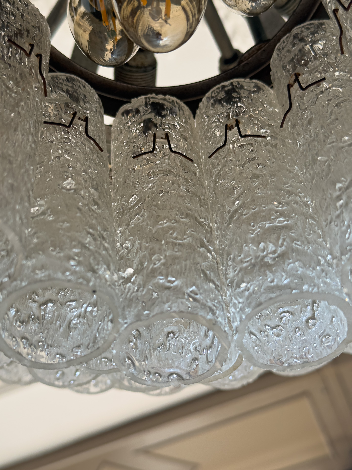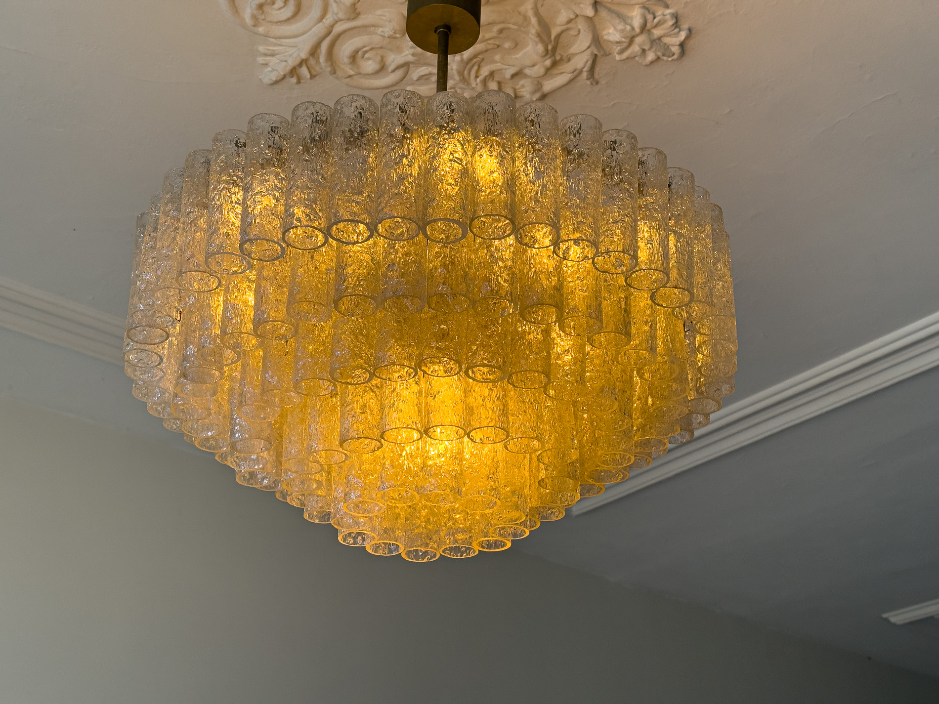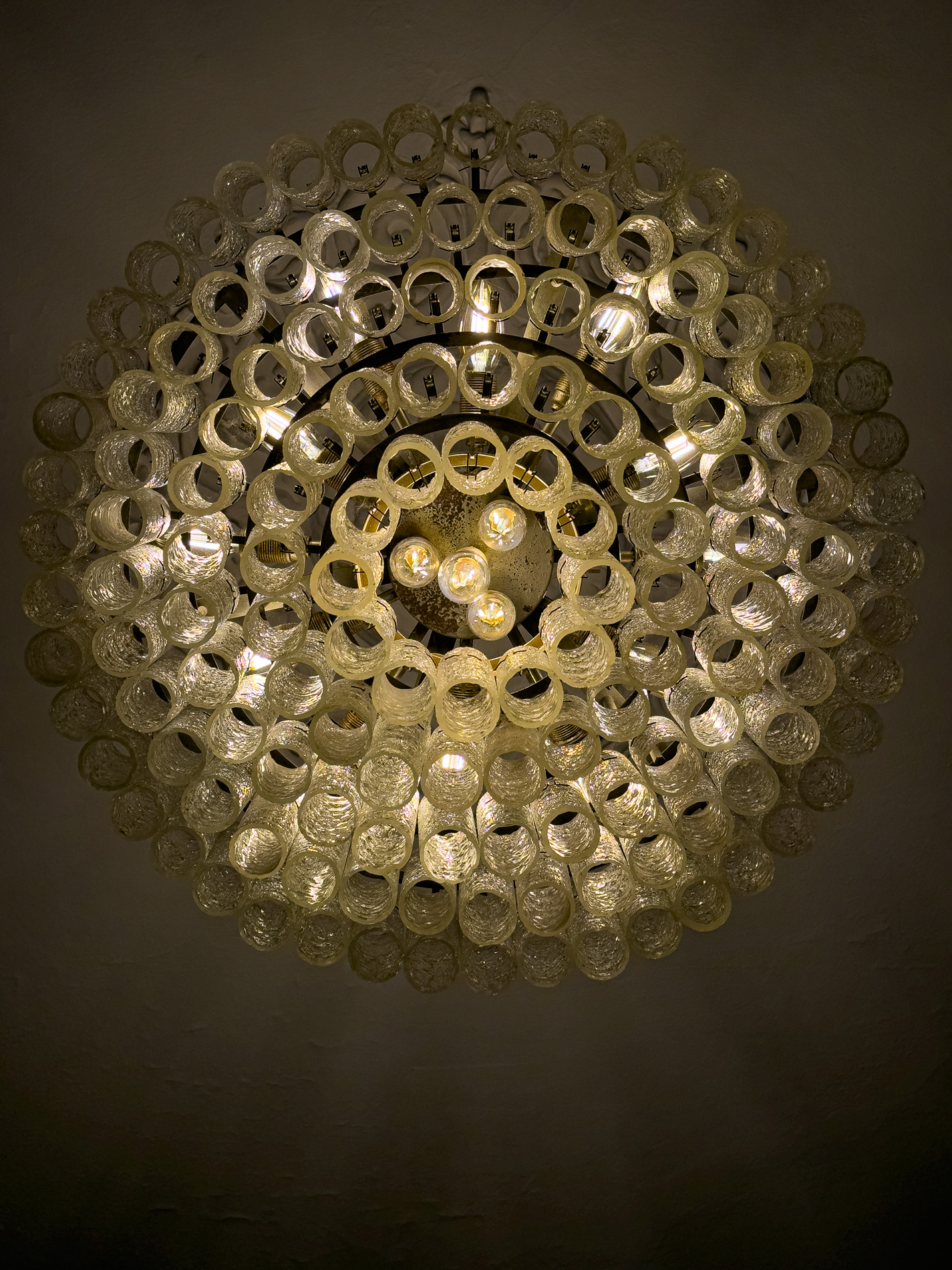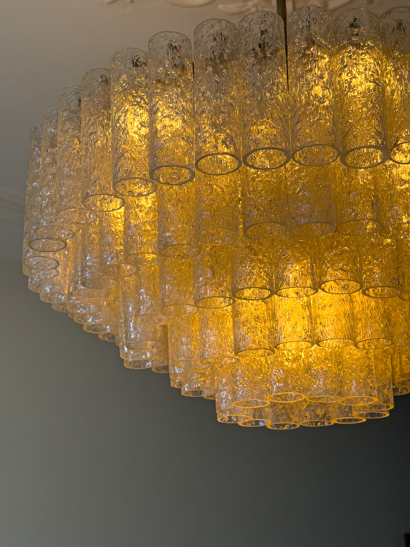 An impressive and elegant lighting statement by Doria Leuchten, featuring a luxurious composition of approximately 180 frosted glass cylinders arranged in a refined, architectural structure. This striking chandelier is equipped with 16 light sources, creating a warm, atmospheric glow while beautifully diffusing light through the textured glass.