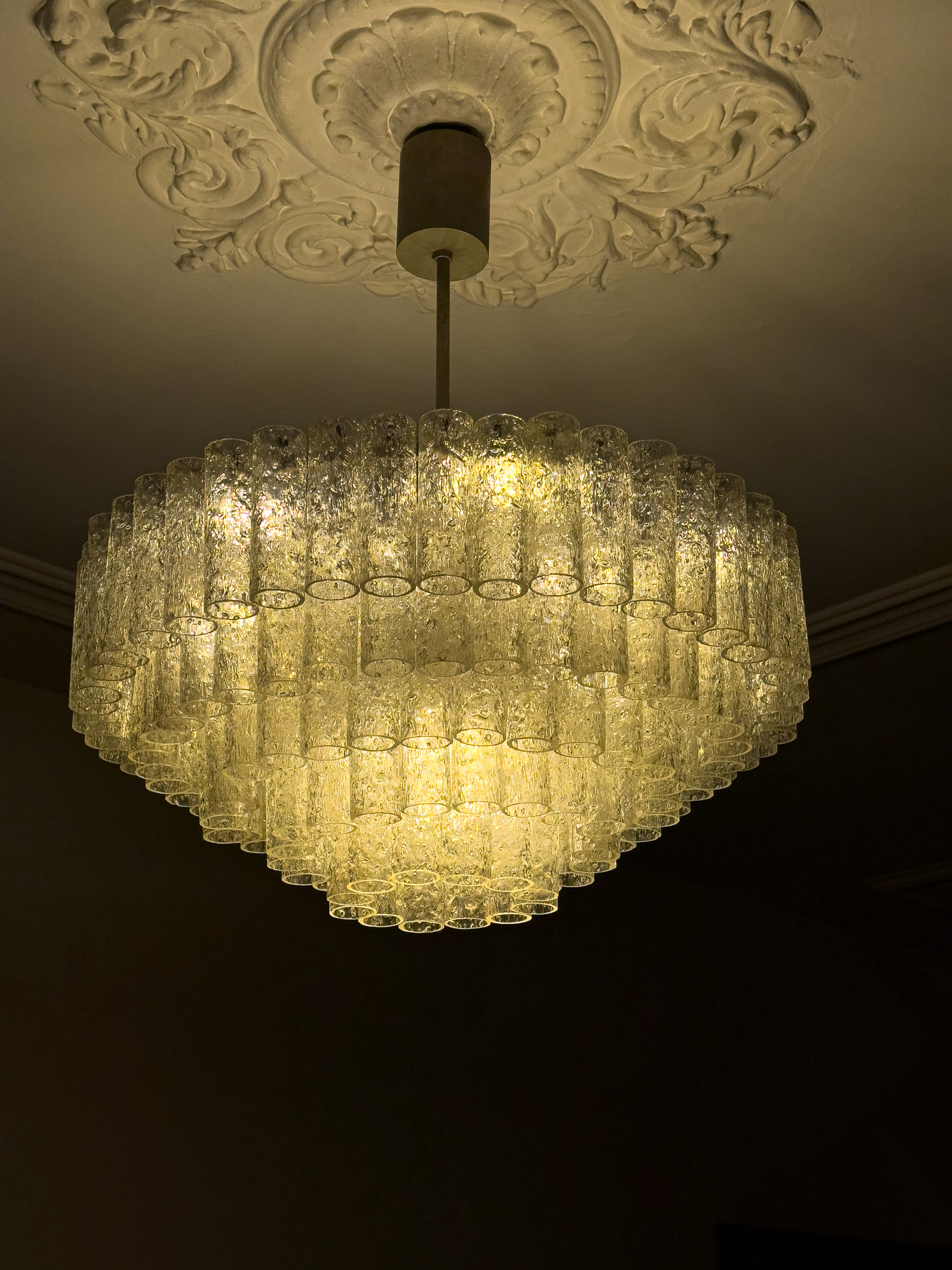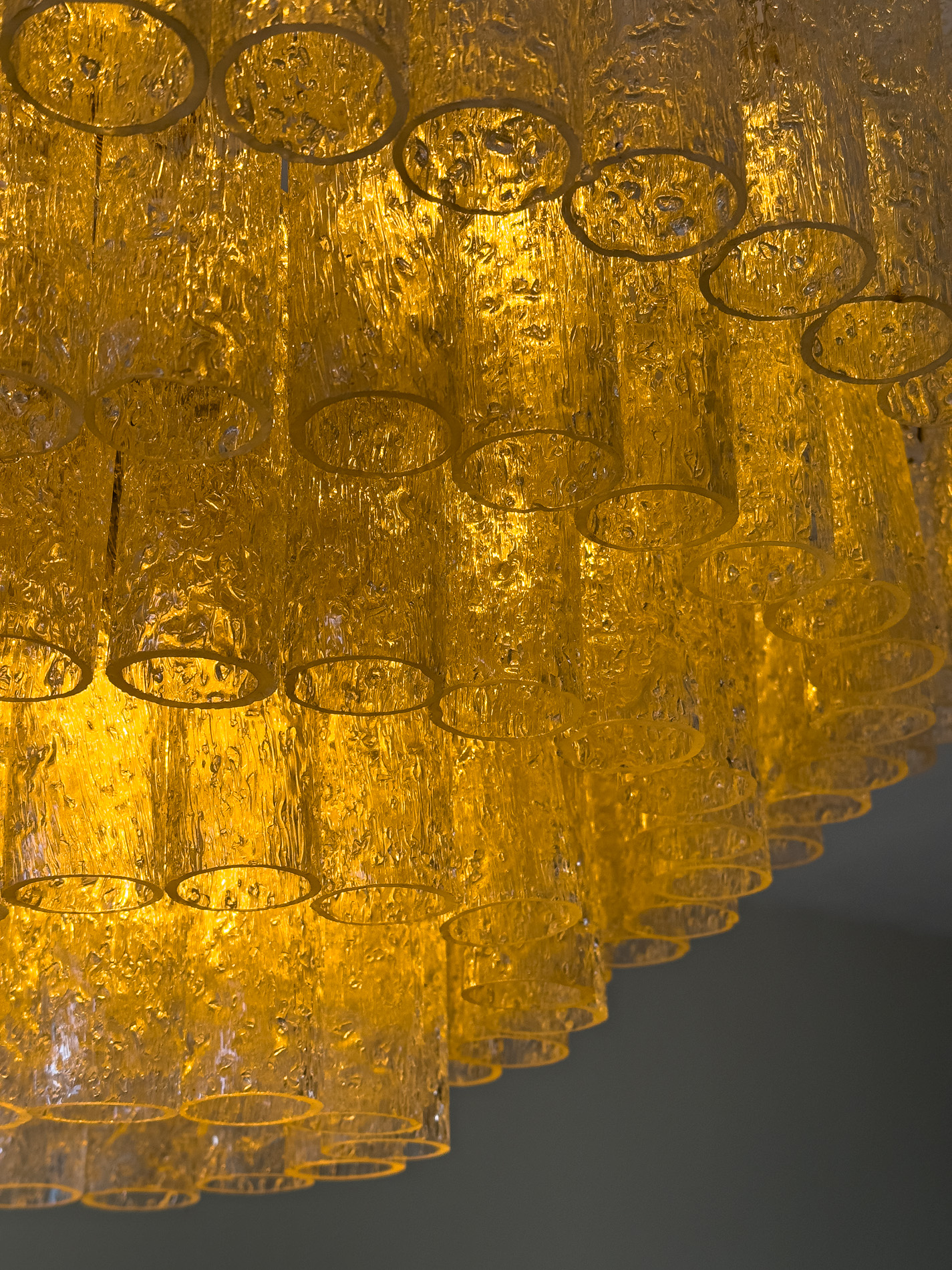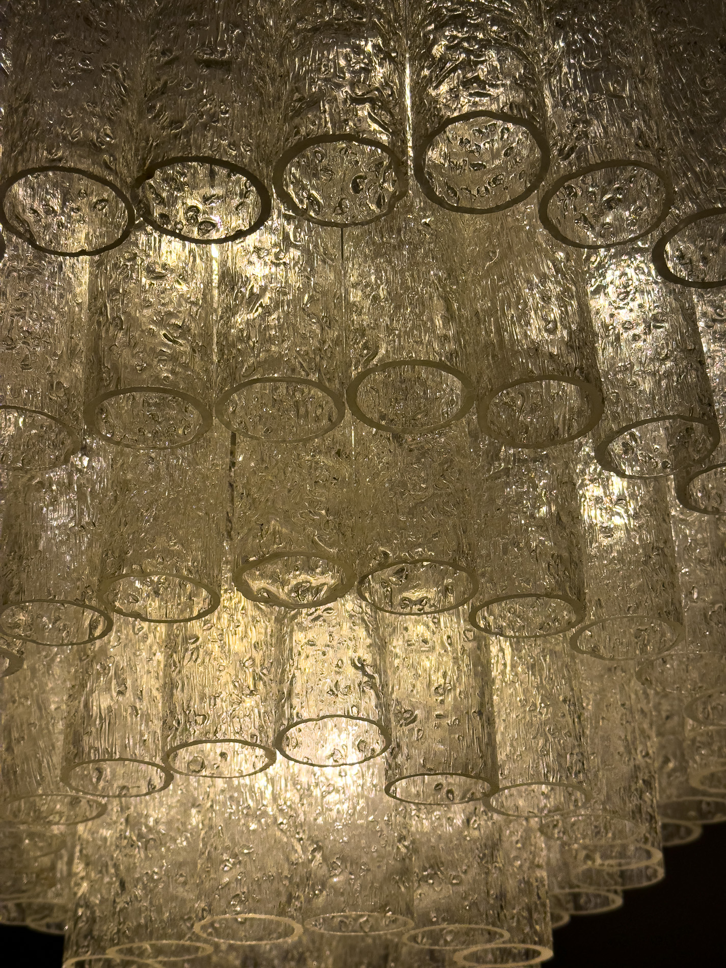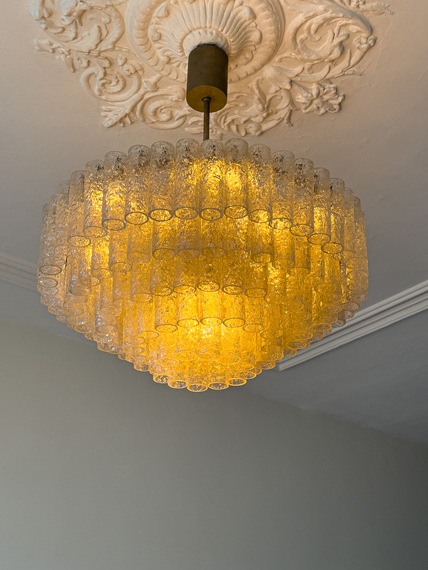 An impressive and elegant lighting statement by Doria Leuchten, featuring a luxurious composition of approximately 180 frosted glass cylinders arranged in a refined, architectural structure. This striking chandelier is equipped with 16 light sources, creating a warm, atmospheric glow while beautifully diffusing light through the textured glass.