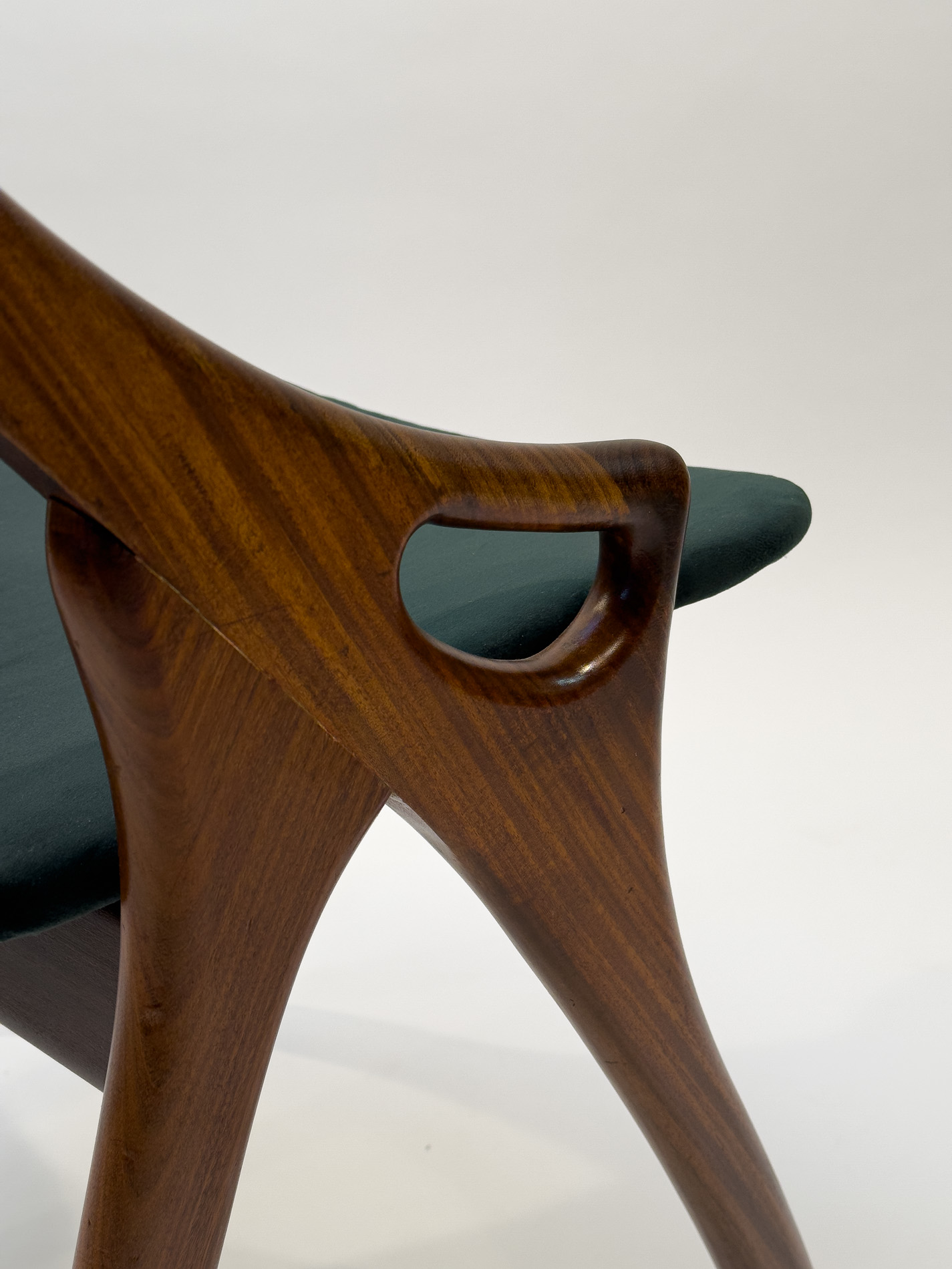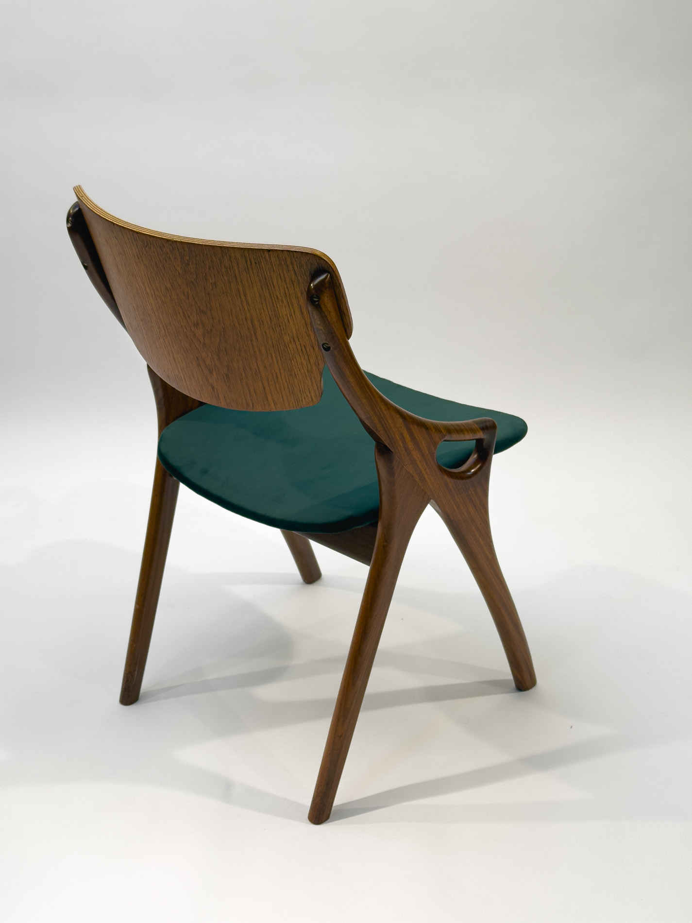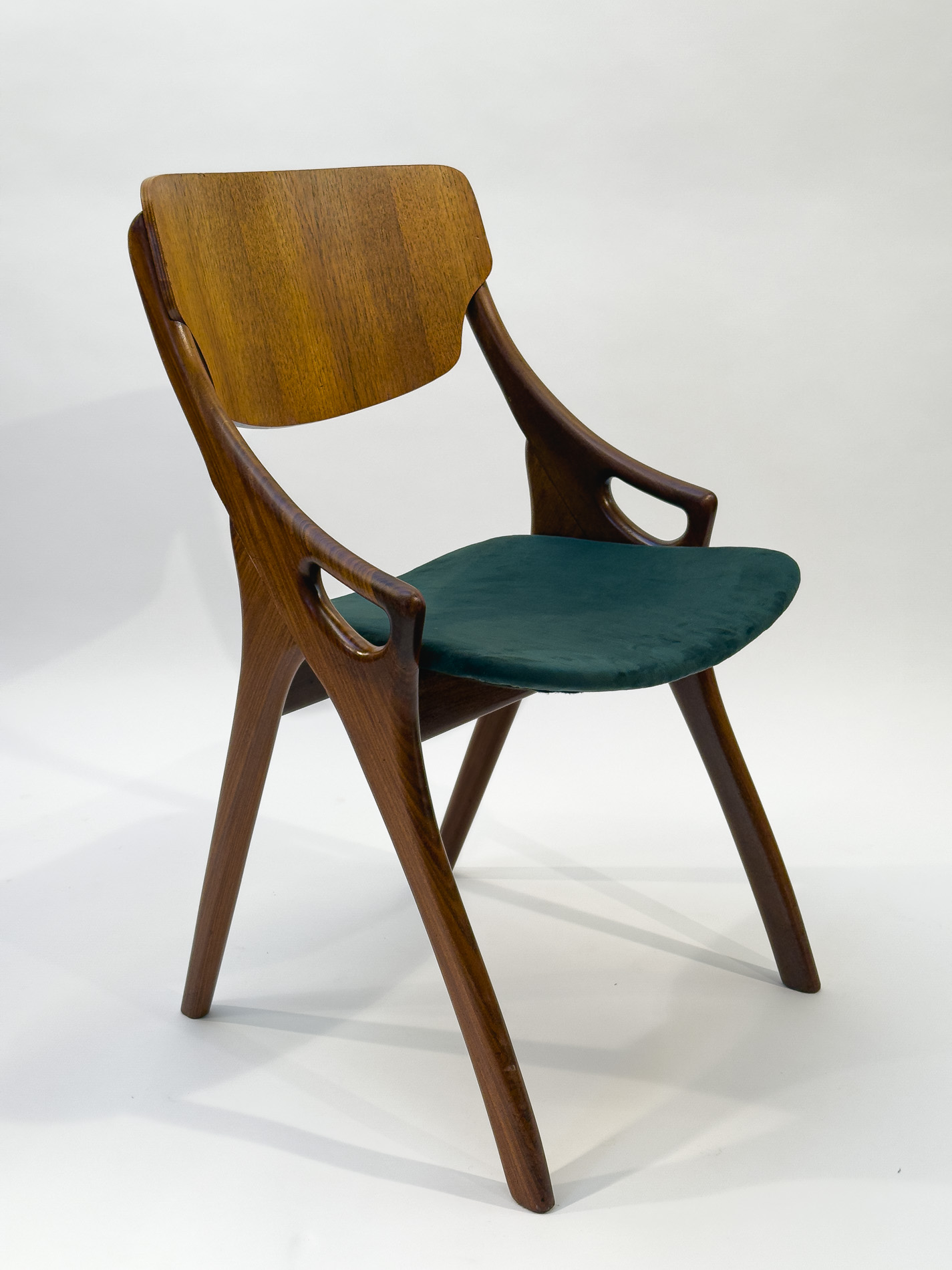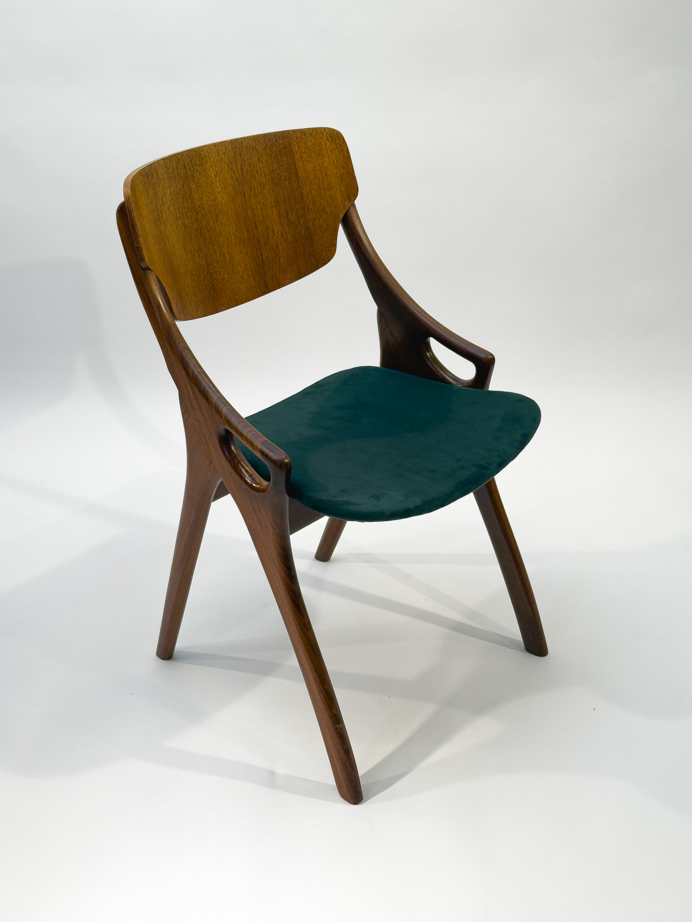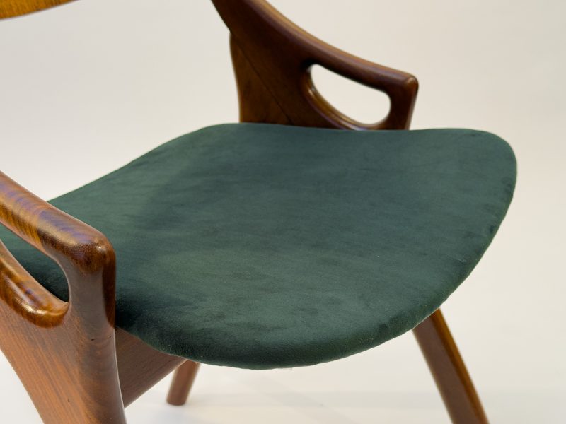 This set of four dining chairs was designed by Arne Hovmand Olsen for Mogens Kold and is a fine example of classic Danish modern design. The elegant frames are crafted from teak, complemented by oak backrests that add a subtle contrast and highlight the quality of the craftsmanship. The seats have been newly reupholstered in green fabric, giving the chairs a refreshed and contemporary look while respecting their original character. The wood has been carefully treated and finished with new oil, enhancing the natural grain and warm tones. As genuine vintage pieces, signs of age and use can certainly be found, which only add to their authenticity and charm. All four chairs are structurally very solid and stand firmly on their legs, offering both comfort and durability alongside timeless design.