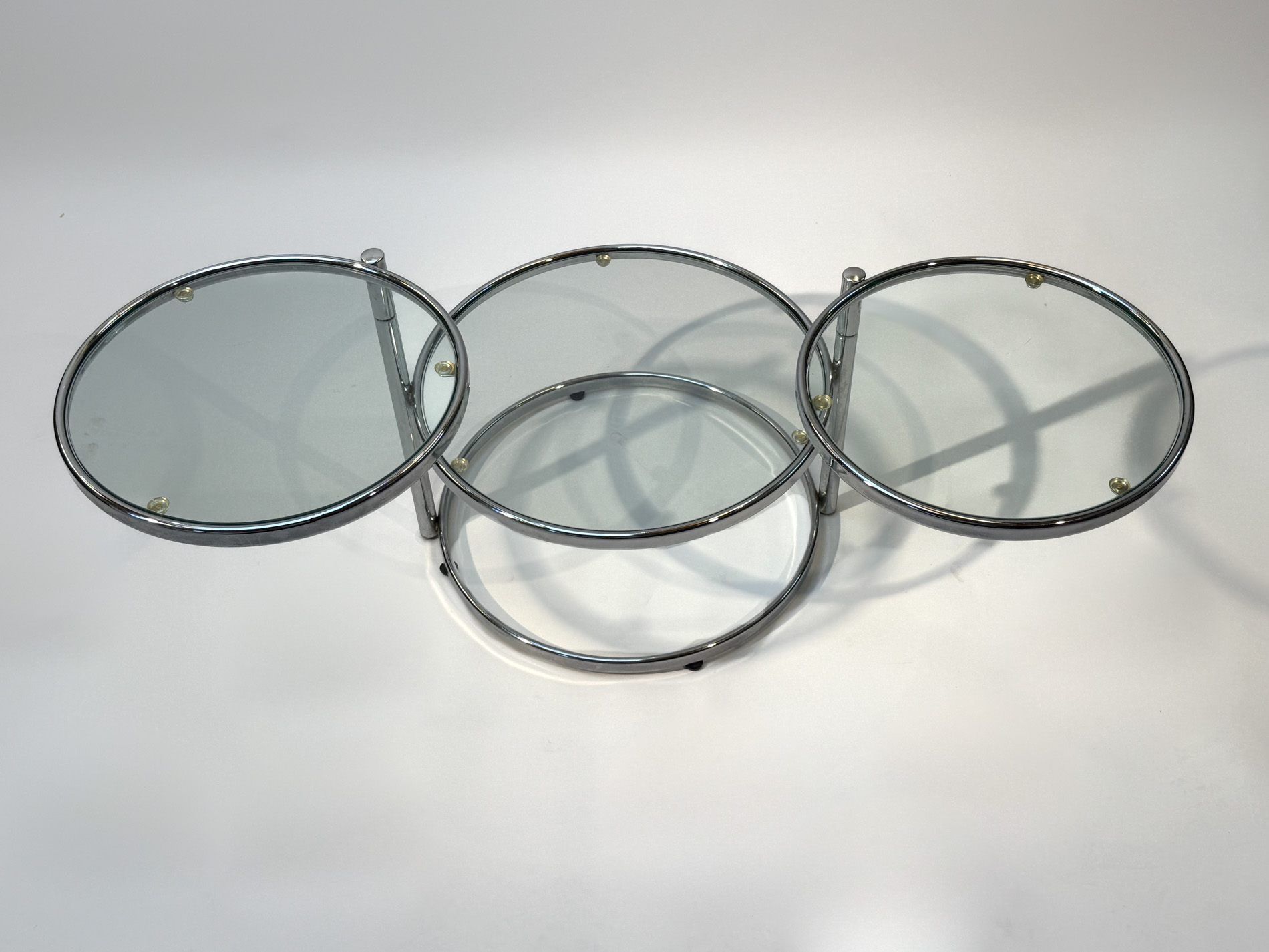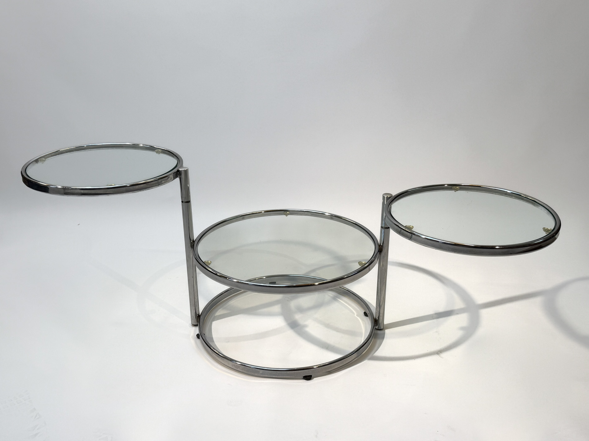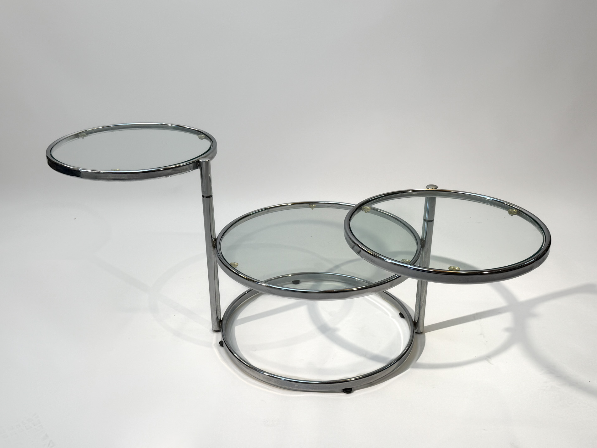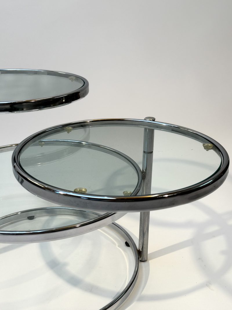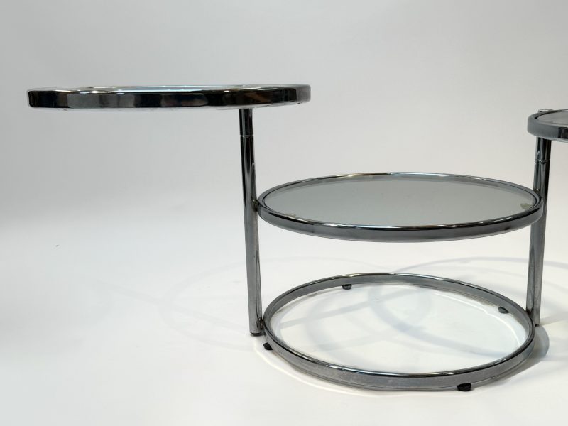 Featuring three circular glass tabletops mounted on sleek chrome arms, each surface can swivel independently, allowing you to adjust the layout to suit your space or occasion. The polished chrome base adds a refined, contemporary touch while keeping the design light and airy.