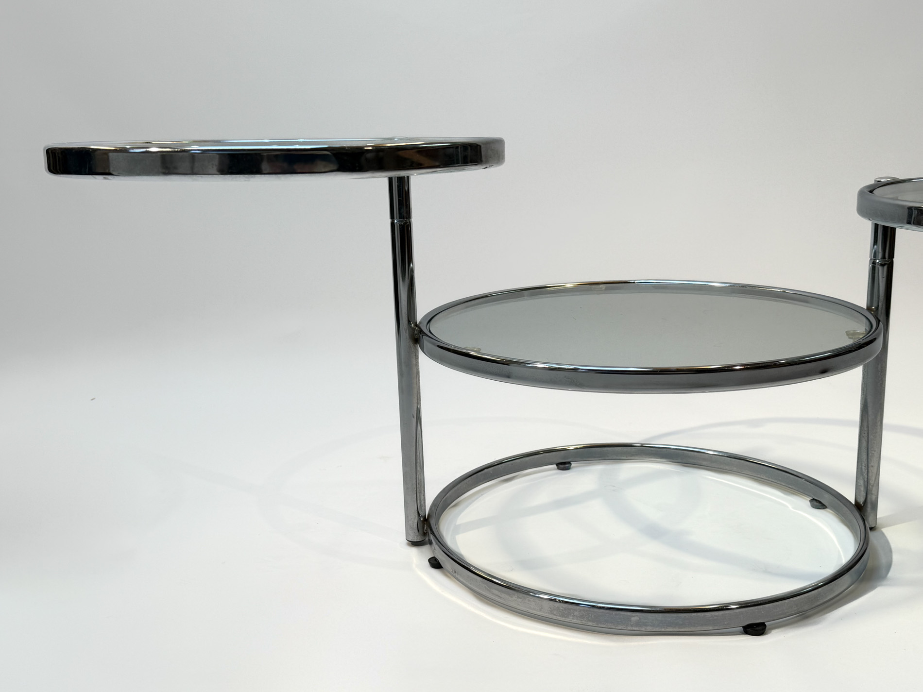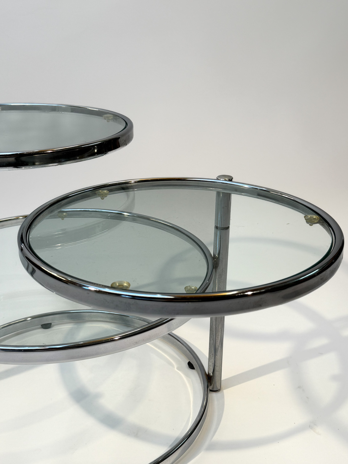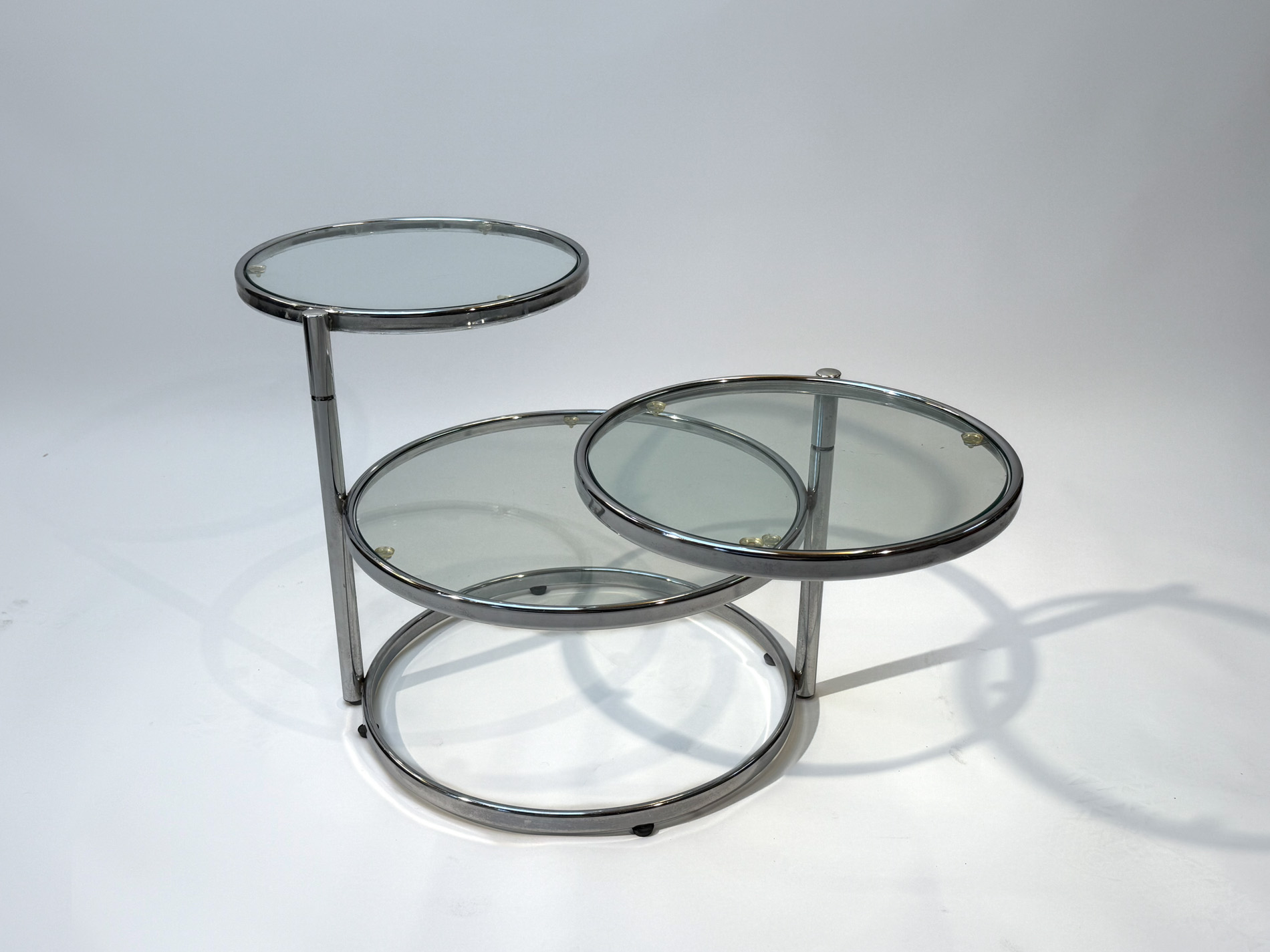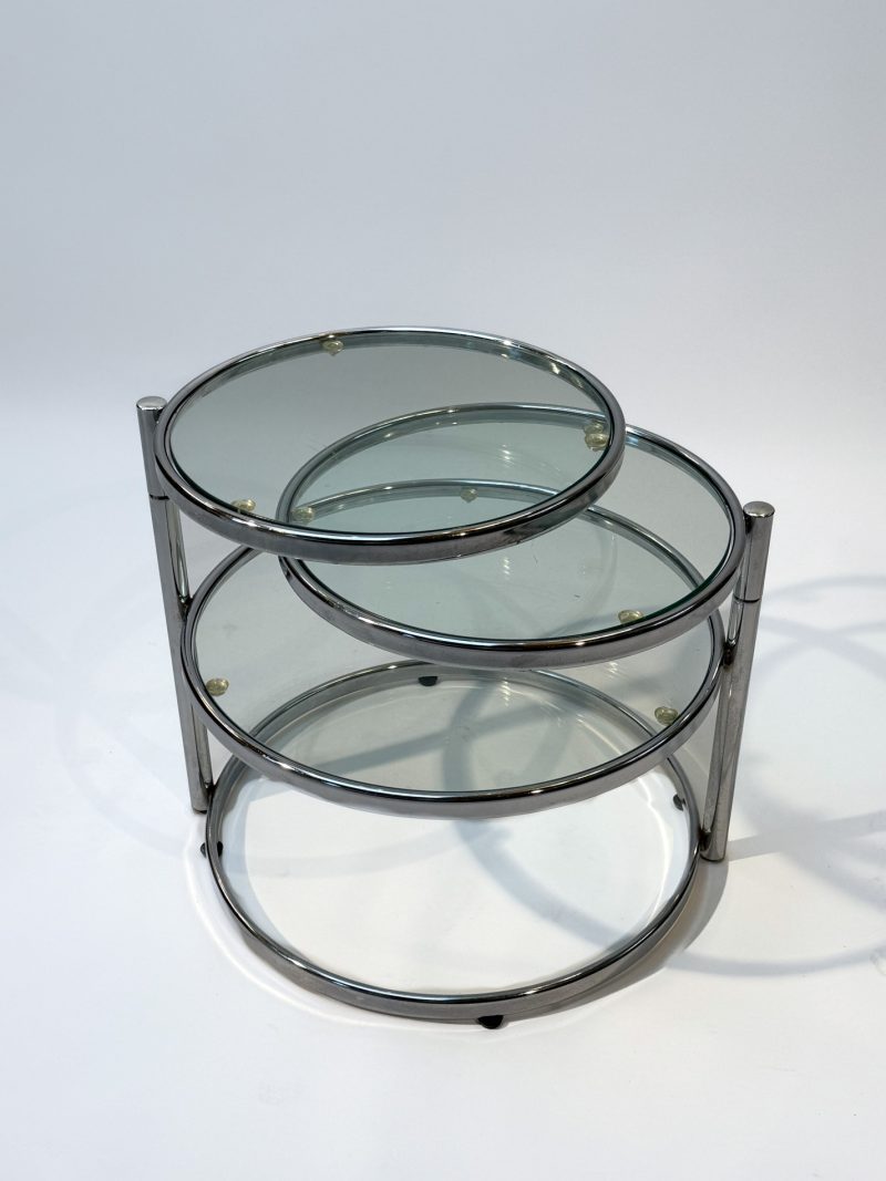 Featuring three circular glass tabletops mounted on sleek chrome arms, each surface can swivel independently, allowing you to adjust the layout to suit your space or occasion. The polished chrome base adds a refined, contemporary touch while keeping the design light and airy.