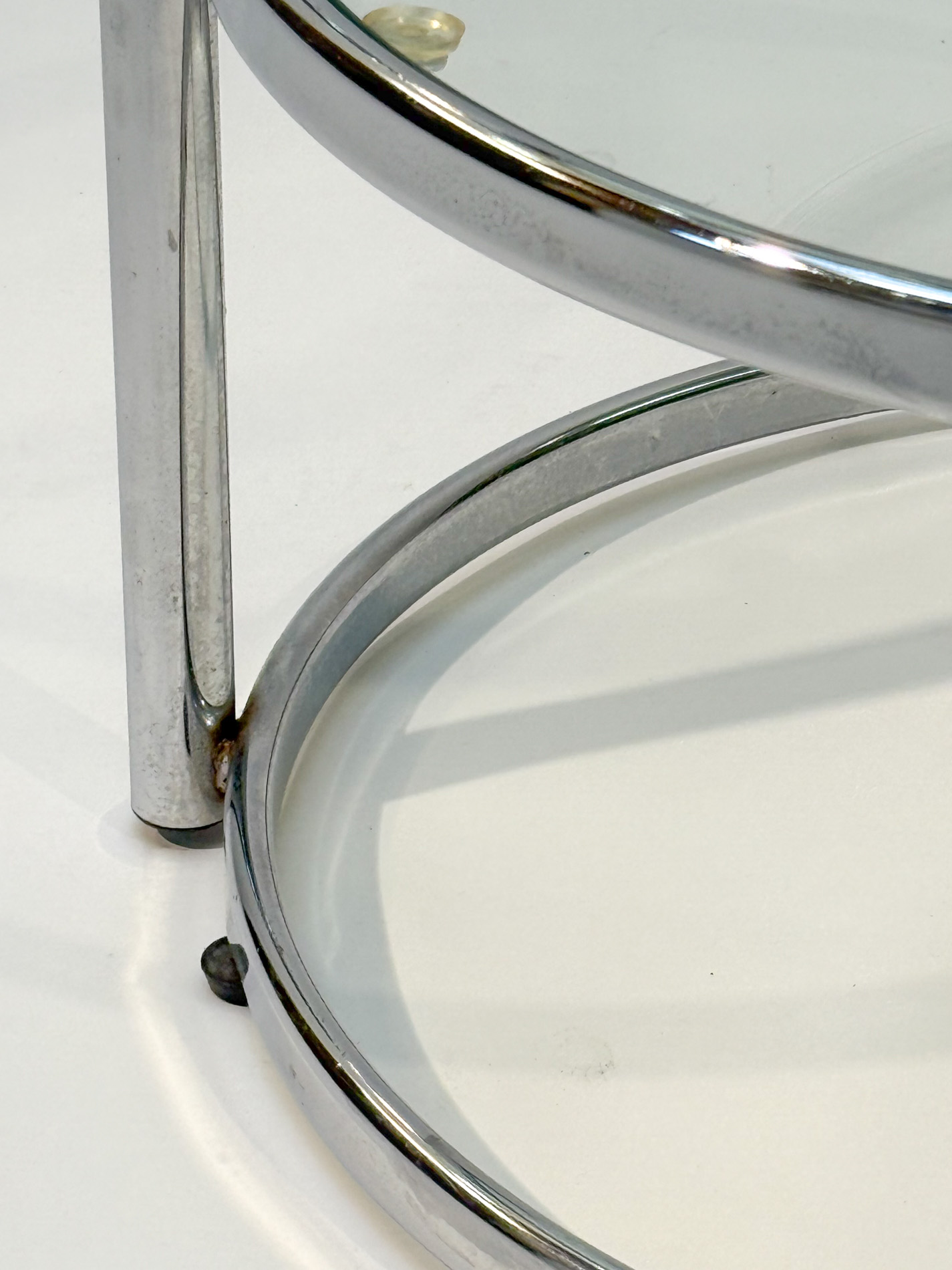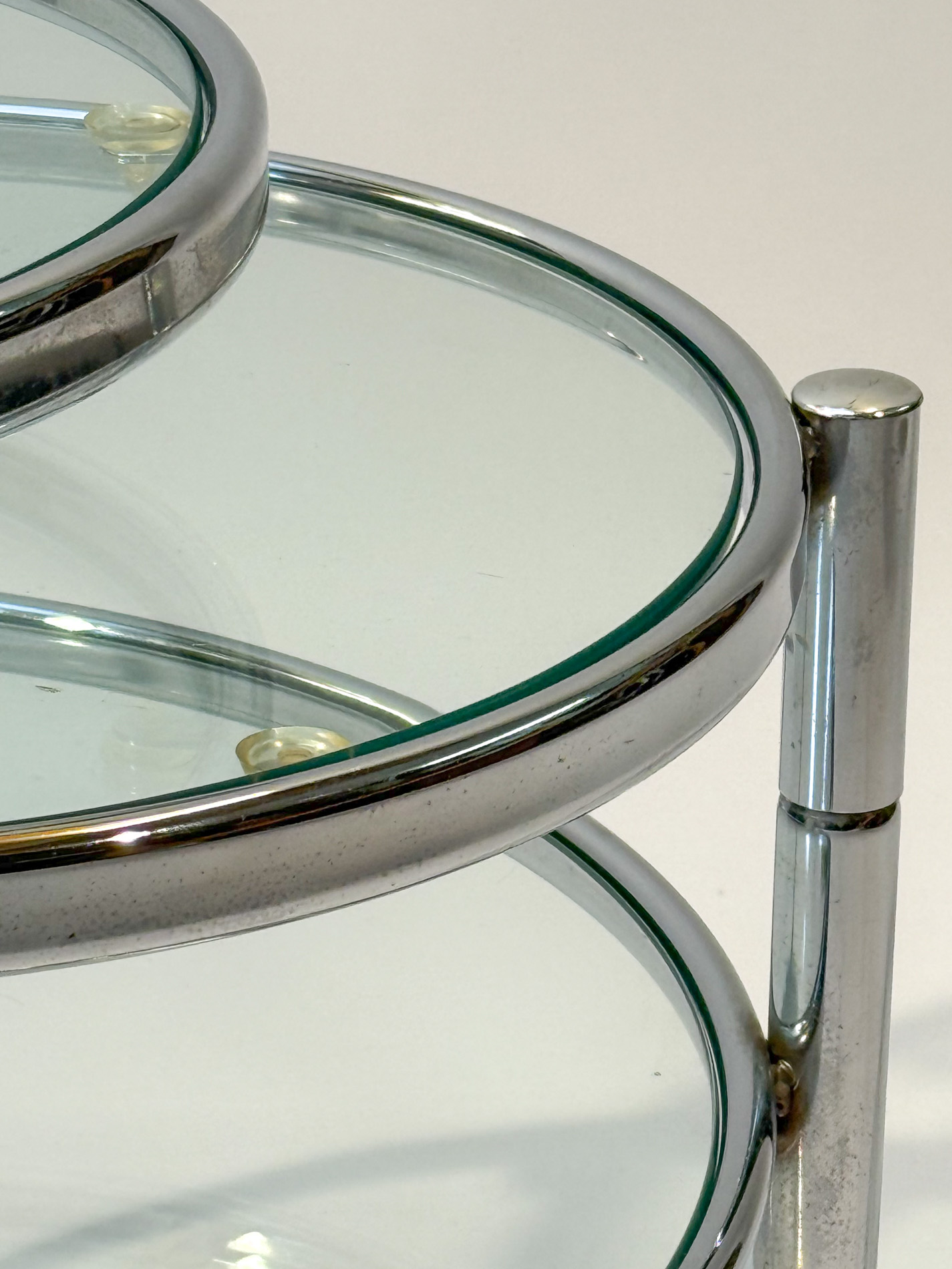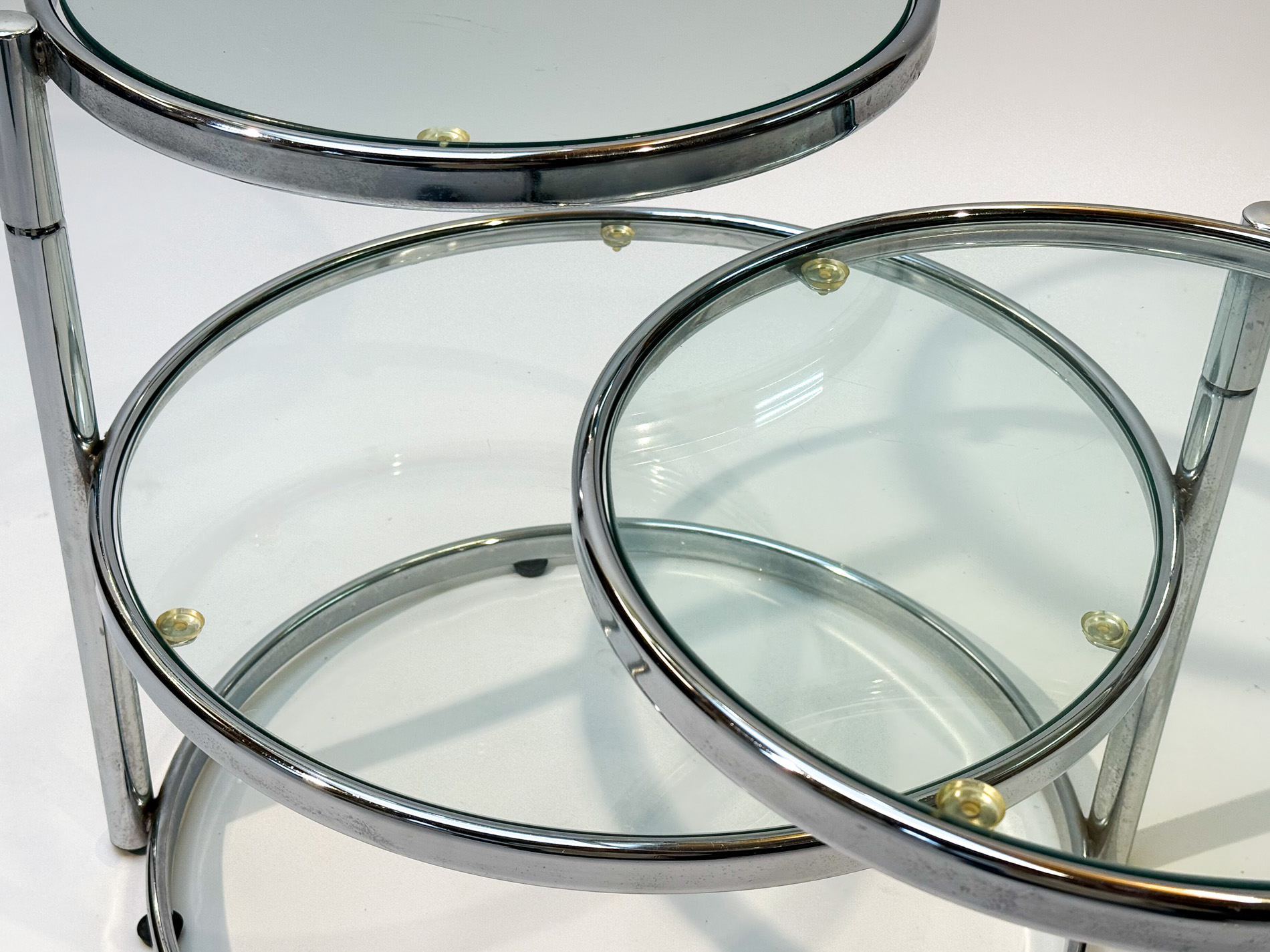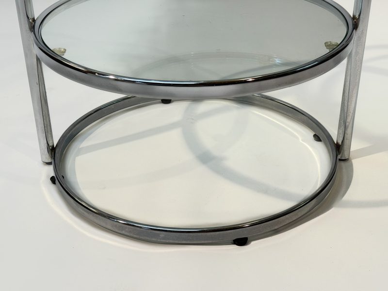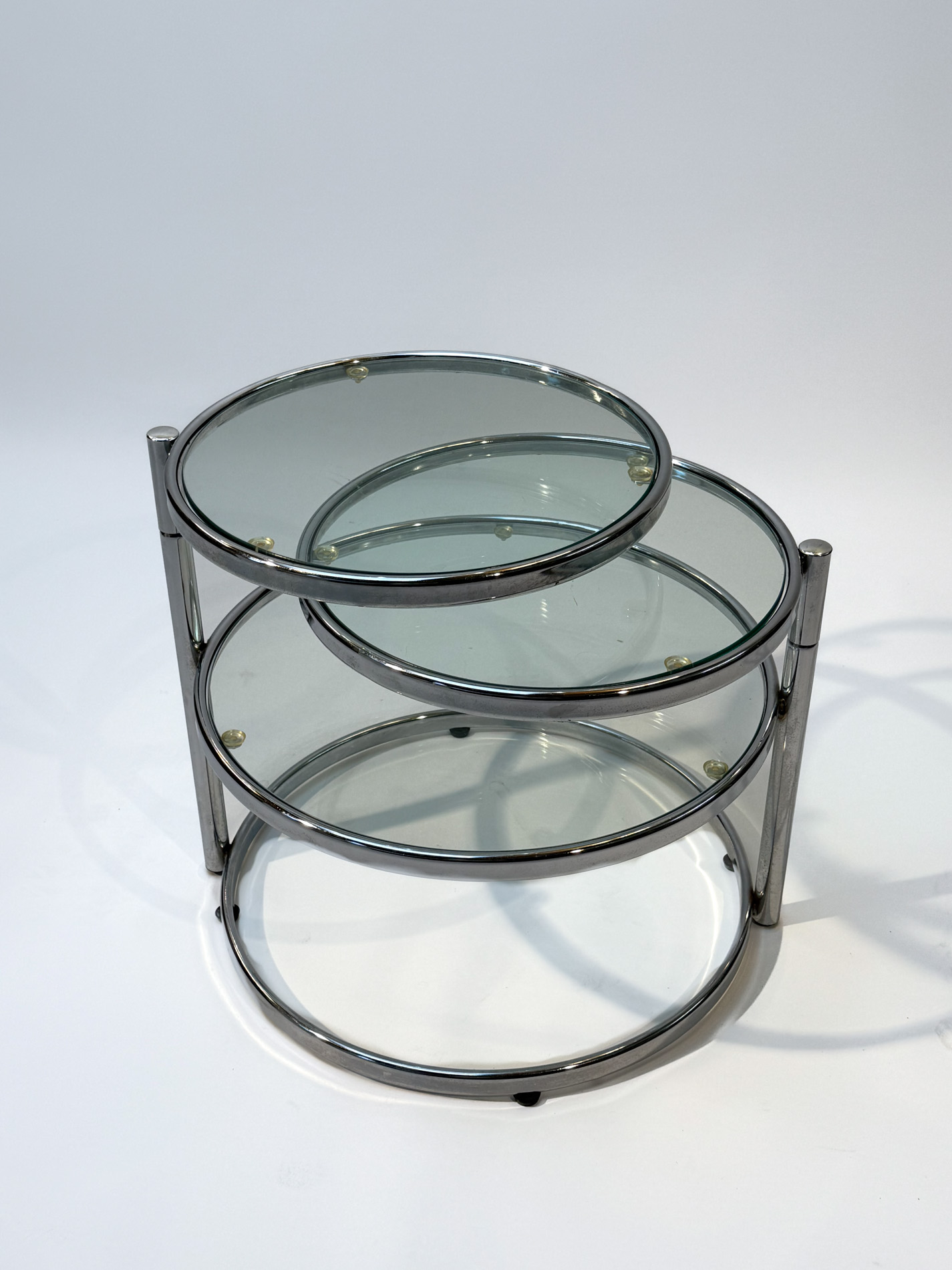Featuring three circular glass tabletops mounted on sleek chrome arms, each surface can swivel independently, allowing you to adjust the layout to suit your space or occasion. The polished chrome base adds a refined, contemporary touch while keeping the design light and airy.